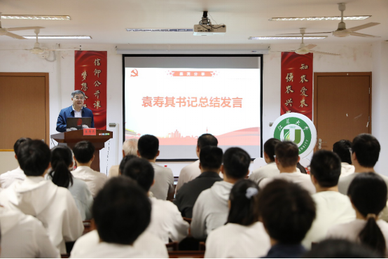 At the beginning of the meeting, the party branch secretary Sha Mengmeng led others to learn the contents on the theme of “Knowing and loving agriculture, strengthening and promoting agriculture". Afterwards, Jin Shude -Honorary Director of Work Committee of Jiangsu University, shared the struggle experience in the period of the older generation to build the agriculture mechanization. Then, five practice groups of the party branch introduced their practice process and results. Finally, Secretary of Party Committee Yuan Shouqi made a summary speech. He first affirmed the effectiveness of this theme education activity, and then combing with his own growth experience, he encouraged students to cultivate innovative spirit, learn professional knowledge, and learn excellent skills.