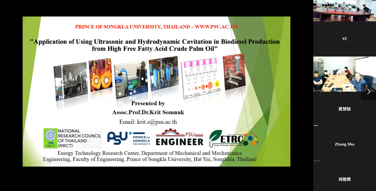 Prof. Tanongkiat Kiatsiriroat from Chiang Mai University, Prof. Krit Somnuk from Prince of Songkla University, Prof. Konlayutt Punyawudho from Chiang Mai University, Prof. Shu Zhang from Nanjing Forestry University, Prof. Shuang Wang, and Prof. Bin Li from Jiangsu University introduce the latest progress on ultrasonic and cavitation biodiesel preparation, green algae thermal conversion applications, and hydrogen production from high-temperature synergistically catalytic decomposition of biomasses, respectively. The forum has added a series of seminars by experts. Prof. Konlayutt Punyawudho gives a course report on fuel cells and their components for graduate students, introducing his research in polymer dielectric membrane fuels and energy storage. In the next six months, five experts from Thailand will give seminars on renewable energy and carbon neutrality for graduate and undergraduate students at Jiangsu University. This forum further enhances the mutual understanding and trust of researchers between China and Thailand in renewable energy, and lays a solid foundation for in-depth international cooperation under the Belt and Road Initiative.
